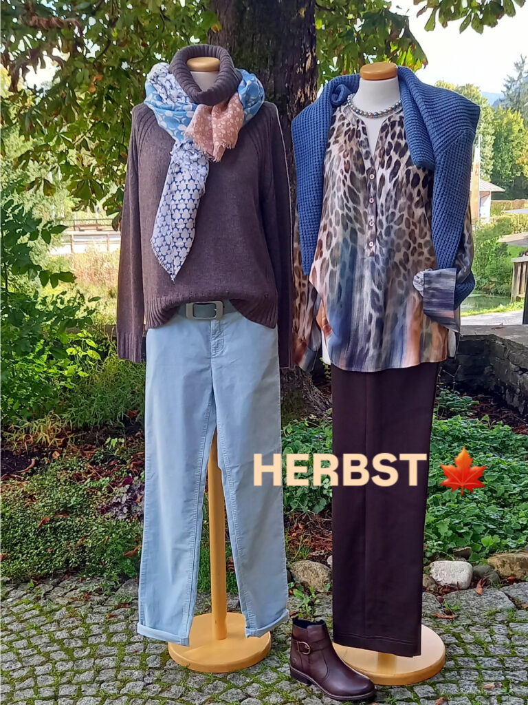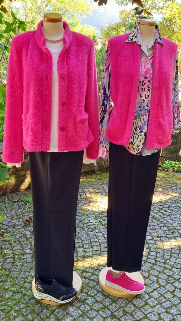 Sanfte Beigetöne, warmes Braun und Akzente in kräftigem Pink oder sattem Blau bestimmen das aktuelle Herbstbild. Flauschige Westen, Strickpullover und leichte Steppjacken lassen sich wunderbar kombinieren – ideal für Spaziergänge, Stadtbummel oder den gemütlichen Nachmittagscafé.