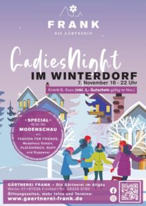 Wir laden Sie herzlich ein zur Ladies Night im Winterdorf bei Frank – Die Gärtnerin in Fischen!Am Freitag, den 7. November 2025, ab 16 Uhr erwartet Sie ein stimmungsvoller Abend voller Mode, Inspiration und guter Laune.